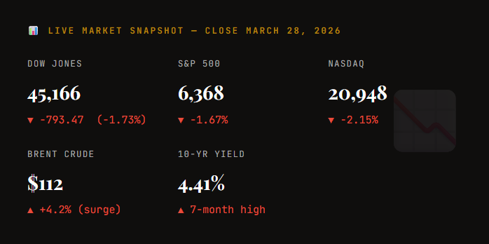If you’re looking for the latest stock market news today in the USA, March 28, 2026 brings some deeply concerning headlines for investors. Wall Street closed out the week on a brutal note, with all three major indexes posting sharp losses as the US-Iran war continues to batter energy markets, push oil prices to alarming heights, and fuel fears of stagflation. The Dow Jones entered correction territory, the S&P 500 hit a seven-month low, and the Nasdaq extended its slide deep into correction territory. Here is a complete breakdown of everything moving markets right now — and what investors should watch heading into next week.